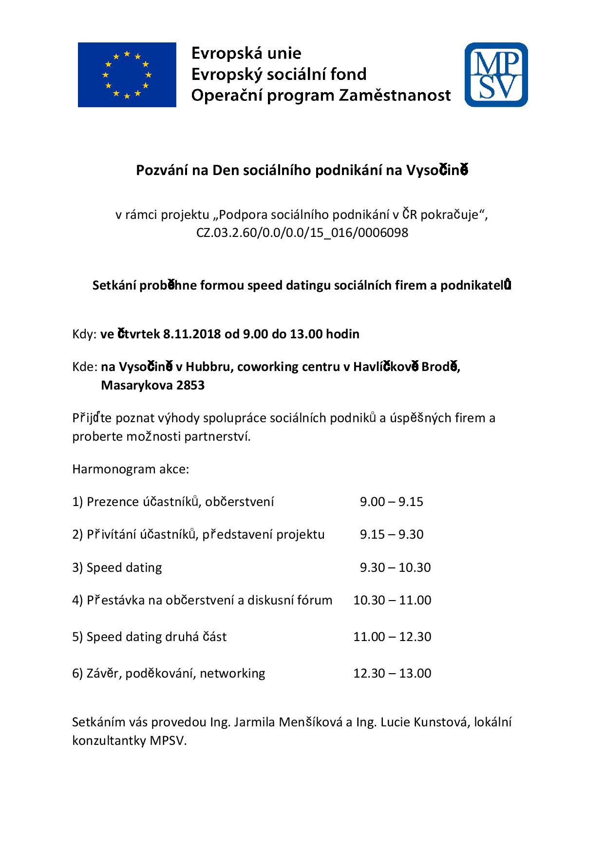 Setkání proběhne formou tzv. speed datingu, kdy si každá firma s každým sociálním podnikem vymění v krátkém časovém limitu ty nejdůležitější informace.